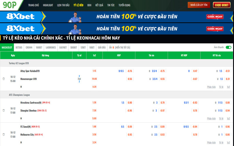 Các loại tỷ lệ kèo được cập nhật tại 90Phut TV