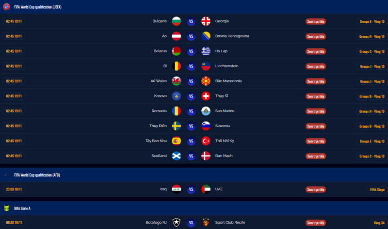 - Đội tuyển quốc gia: Các trận vòng loại World Cup, Euro hay Copa America đều có lịch thi đấu cập nhật chuẩn xác, giúp fan theo sát hành trình của đội tuyển yêu thích.