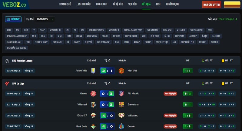 Một điểm cộng lớn nữa là Vebo TV tổng hợp kết quả bóng đá của rất nhiều giải đấu. Anh em có thể theo dõi: