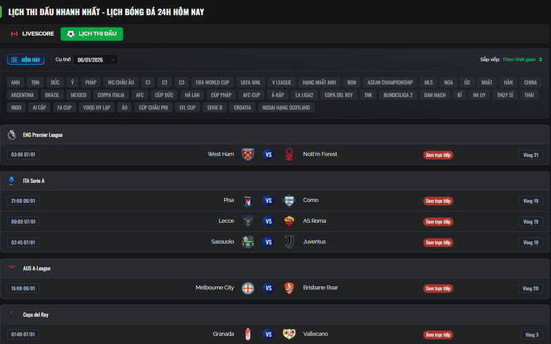 Với số lượng hàng trăm trận đấu diễn ra mỗi ngày trên khắp các châu lục, việc theo dõi lịch thi đấu giúp người hâm mộ luôn chủ động trong việc sắp xếp thời gian. Dù là các giải quốc nội hay những đấu trường quốc tế danh giá, bạn đều có thể dễ dàng tra cứu lịch thi đấu chỉ trong vài thao tác đơn giản.
