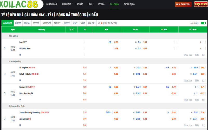Trong thế giới cá cược, việc cập nhật thông tin nhanh chóng và chính xác là yếu tố quan trọng giúp người hâm mộ và người chơi đưa ra những quyết định đúng đắn. Xôi Lạc TV chính là nền tảng đáp cập nhật tỷ lệ kèo nhà cái hàng đầu. Mọi dữ liệu trong bảng kèo được cập nhật đầy đủ và chính xác nhất.