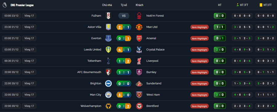 - Ngoại Hạng Anh – giải đấu có lịch thi đấu dày, nhiều trận mỗi vòng.